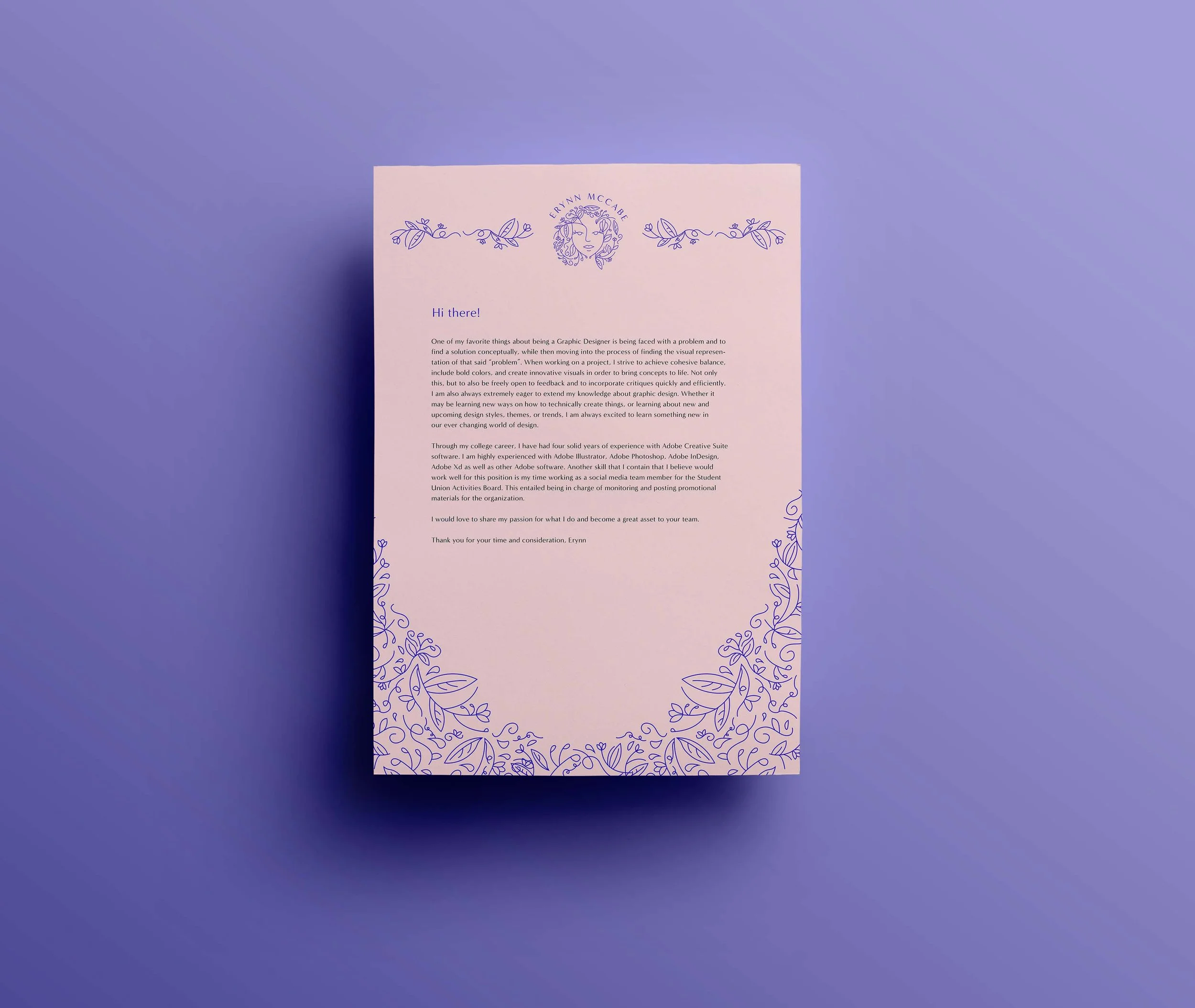 This is an identity system designed for my own personal brand to display myself as a graphic designer and illustrator. The inspiration comes from contour drawings, which is one of my most favorite styles of illustration. My logo is intended to be a representation of myself through aspects of design I enjoy, by the merging of intricate line work and illustration. Within my logo, I include flowers and patterning that roughly symbolize the honey suckle, which is my birth month flower, and is said to symbolize happiness in the Victorian interpretation.