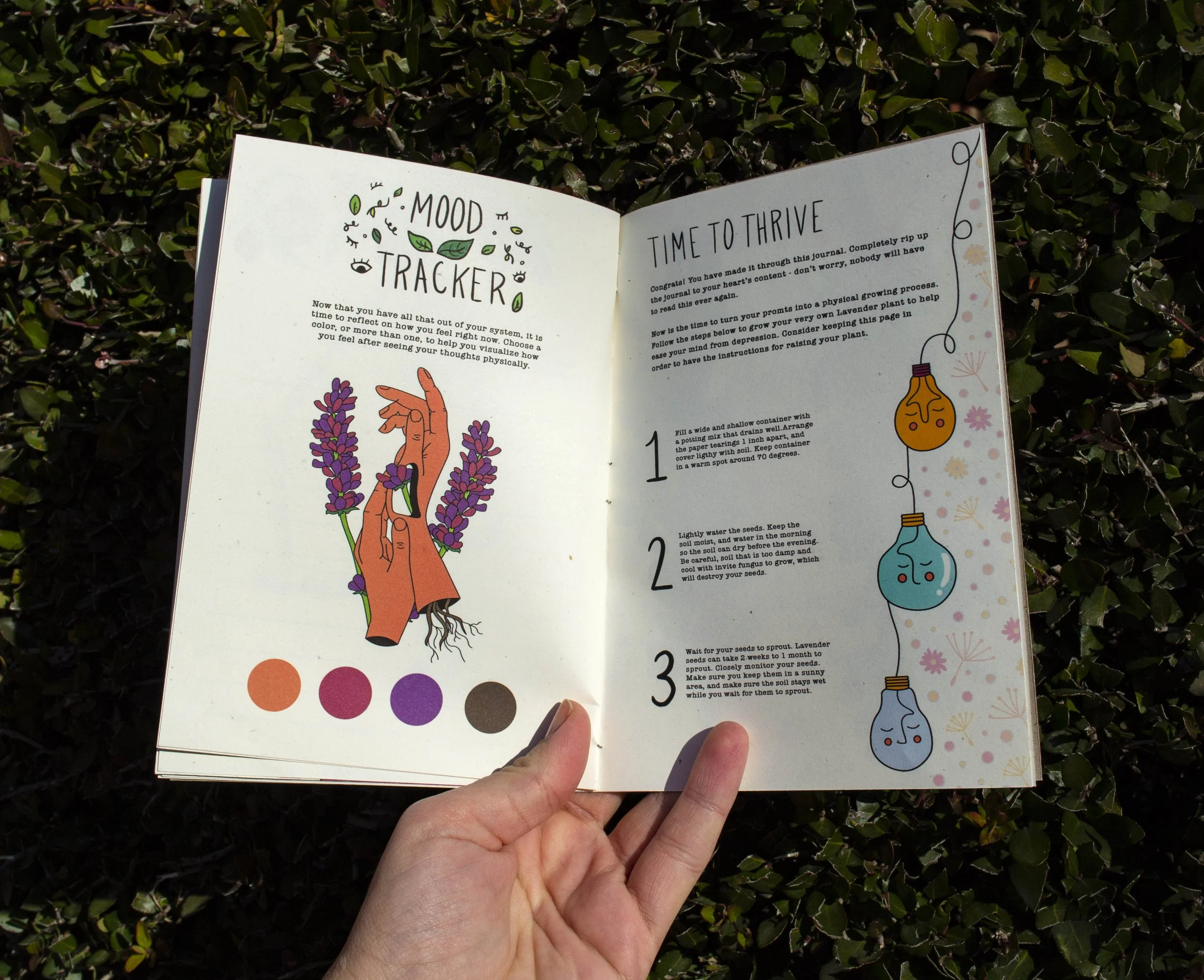My inspiration in creating these journals is the sudden spike in depression and anxiety within college students during the last couple of years. The journals are to be sold in groups of three: one journal for anxiety, one for depression, and one for stress. The journals are made from paper embedded with a specific seed form a correlating plant that helps with each emotion. For example, mint seeds are paired with anxiety, the depression journal is paired with jade, and the anxiety journal is paired with lavender seeds. After completely filling out the journal, it is meant to be torn up and planted. Each journal includes an instruction sheet on how to plant the correlating plant. This is a metaphorical situation where the mental healing process is being compared to a physical growing process.